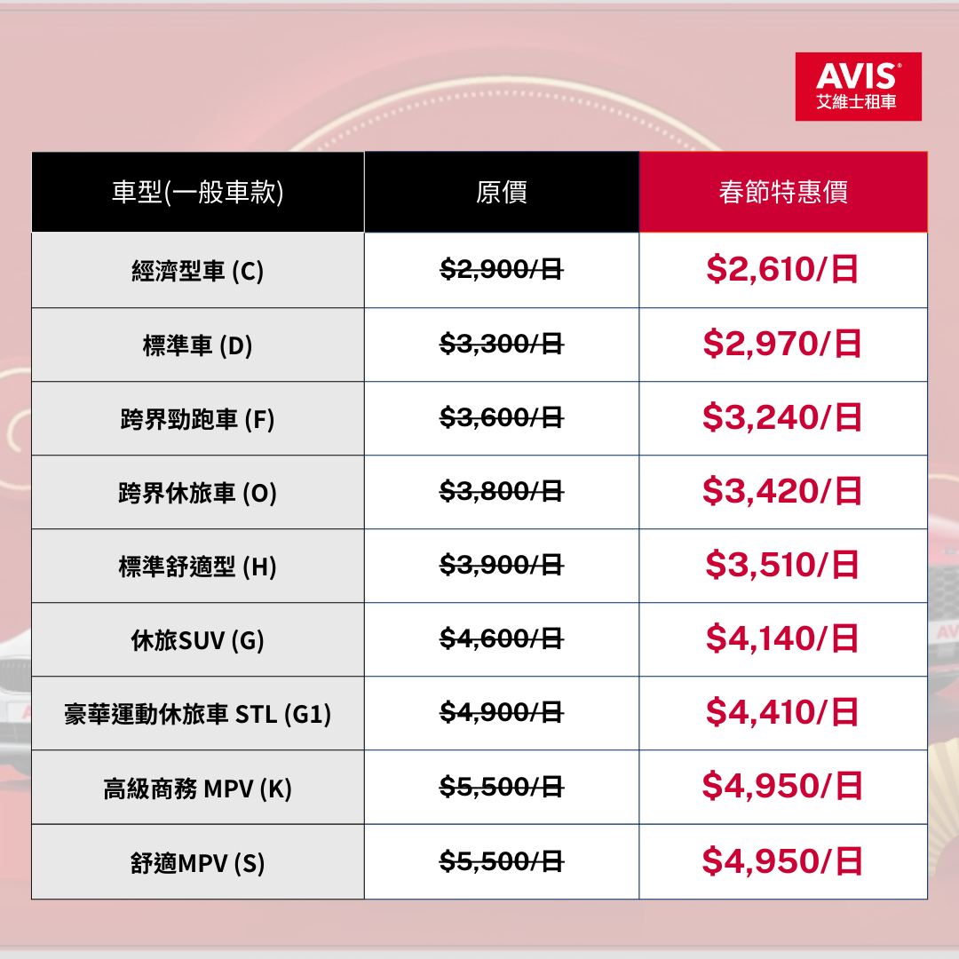 AVIS為長途返鄉或全家出行提供舒適的用車選擇,從大空間MPV到高級尊榮車款,滿足各種需求。