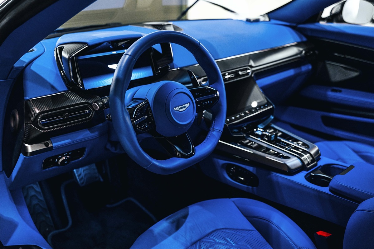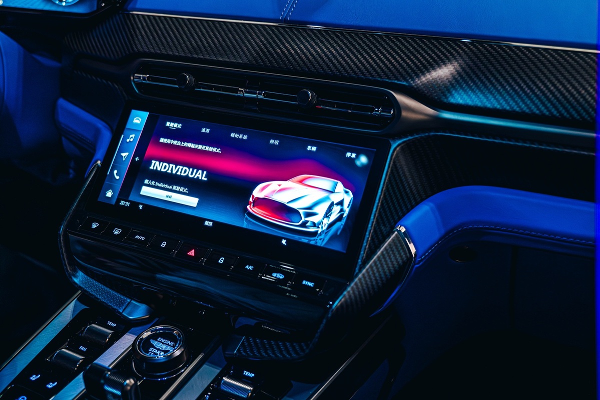 10.25吋全數位儀表板清晰傳遞駕駛資訊,並提供雙環或單環的自訂義顯示;10.25吋螢幕提供多功能手勢控制技術,並支援無線Apple CarPlay功能。實心金屬旋鈕及滾輪的優雅光澤提供精緻觸感,玻璃材質的引擎啟動發光按鈕位於中控台中央,提升發動過程的滿滿儀式感, Aston Martin車室內細膩經典的品味氛圍,完美呈現 Aston Martin打造旗艦車型的精湛工藝和無比自信。