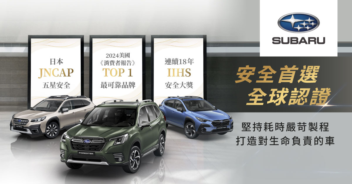 SUBARU「安全首選,全球認證」購車專案即日起全面開跑,日本原裝進口、榮獲JNCAP五星大賞的跨界潮旅CROSSTREK,超值入門價96.8萬起即可體驗SUBARU招牌對稱式全時四輪驅動及水平對臥引擎等多項領先科技;連續18年獲選美國IIHS最佳安全中型SUV殊榮的超熱銷車款FORESTER,超級震撼價116.8萬起即可入主旗艦級安全休旅! SUBARU頂級豪華休旅OUTBACK,傲視進口品牌同級LSUV的全方位的強悍性能、越野、安全及實用性,本月入主最後席次即享最強檔142.8萬起優惠價;SUBARU旗下同樣榮獲美國IIHS最強純電四驅休旅SOLTERRA本月入主即享149.8萬的震撼價格,優惠幅度高達40萬元,嚮往零碳排人車生活的您千萬不容錯過,超殺優惠最後倒數。