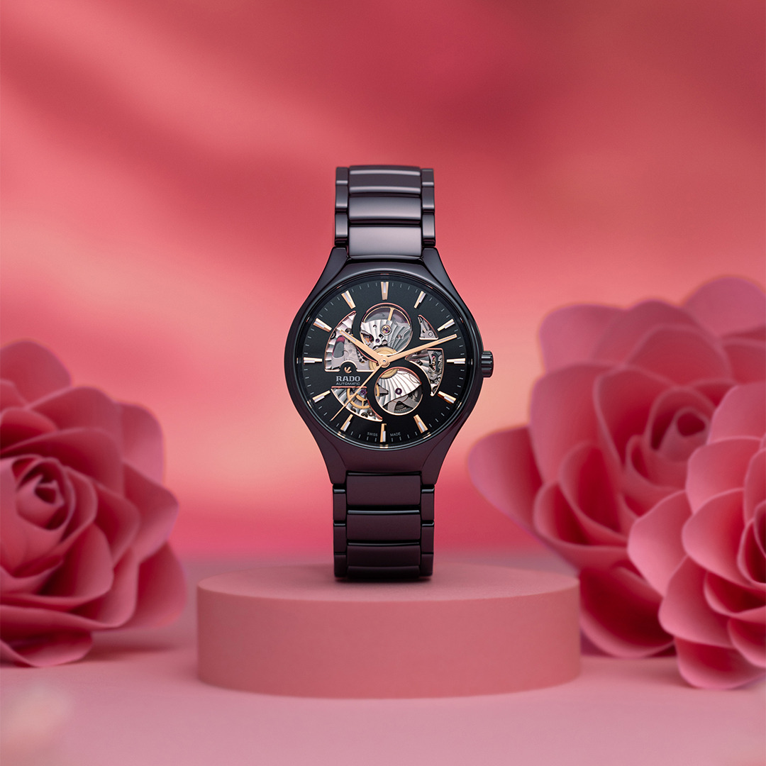 這款黑色高科技陶瓷腕錶象徵著深沉且持久的愛情,猶如兩顆心之間的永恆契約,完美詮釋了情人節的浪漫氛圍。腕錶由一體成形的拋光黑色高科技陶瓷錶殼和錶冠打造,融合現代科技與奢華設計。黑色PVD塗層鈦金屬底蓋搭配藍寶石水晶,無論何時佩戴,都能欣賞到機芯的每一刻脈動,呈現動力與美學的完美結合。錶盤設計選用黑色太陽紋錶盤,並搭配精緻的玫瑰金色斜面與灰色印紋分鐘圈,層次感分明。錶盤上的黑色背景配以玫瑰金色Rado可擺動錨型符號,並印有品牌標誌,增添辨識度和獨特性。黑色拋光高科技陶瓷錶鏈與鈦金屬三折式錶扣,簡潔優雅,完美襯托出腕錶的奢華感,成為情人節送禮的理想之選。