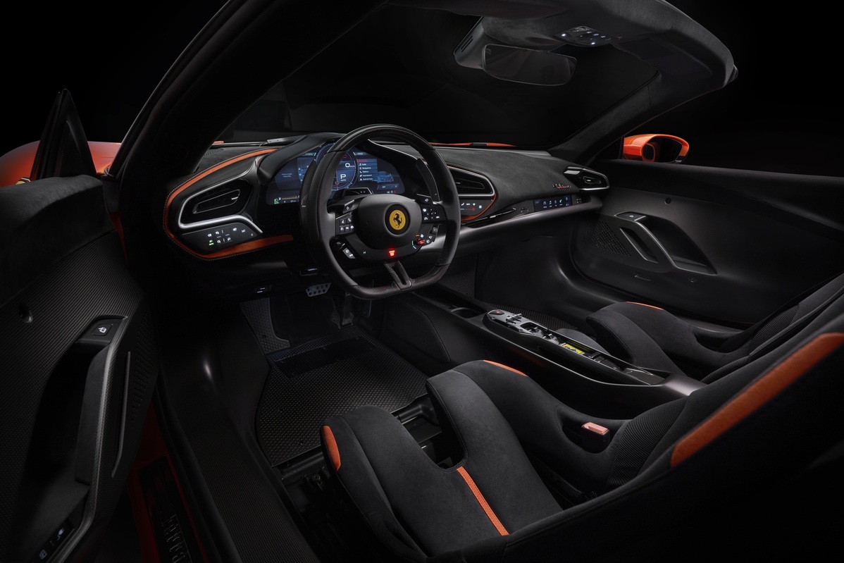 裸露的緊固件與濃厚的賽車氛圍相得益彰。中控區域採用全碳纖維結構,並嵌入立體感設計的中控台,整合各項控制裝置。最引人注目的,莫過於標誌性的「換檔結構」設計,這項元素已成為近年Ferrari量產車型的經典標誌。