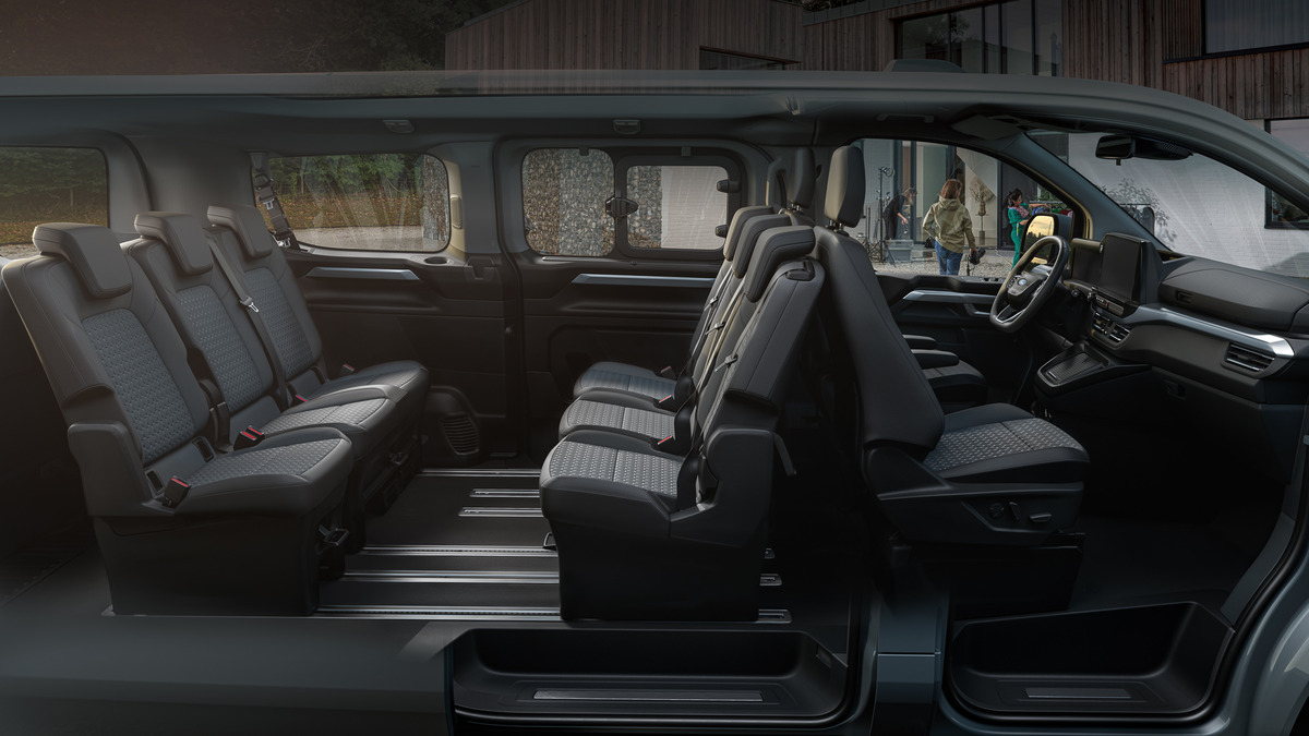 The All-New Ford Tourneo Custom福特旅行家全新設計的車身格局,透過車身長度、軸距提升,以及縮短前懸設計,帶來更具餘裕的座艙空間彈性,同時,藉由下修的車身高度及離地高設定,不僅讓福特旅行家能夠輕鬆應對台灣多數室內停車場的入口高度限制(2公尺 ),亦大幅提高了乘客以及大型物件上下車之便利性。座艙內部搭載無段式滑軌式座椅系統(內建同級唯一會議對座模式,Bus Titanium Pro八座車型專屬),賦予了極高的空間彈性變化。駕駛及乘客可透過車內地板的滑軌輕鬆移動車內座椅,並可藉由座椅的傾倒及拆卸機制,靈活地配置多元化的座艙空間布局。同時,因應車型不同,提供對開式尾門/上掀式尾門兩種設定,搭配Kombi車型1,858至3,650L及Bus車型819至1,354L的行李廂容積,皆能充分滿足駕駛及乘客依循自身需求,載運大型物件或行李的需求。