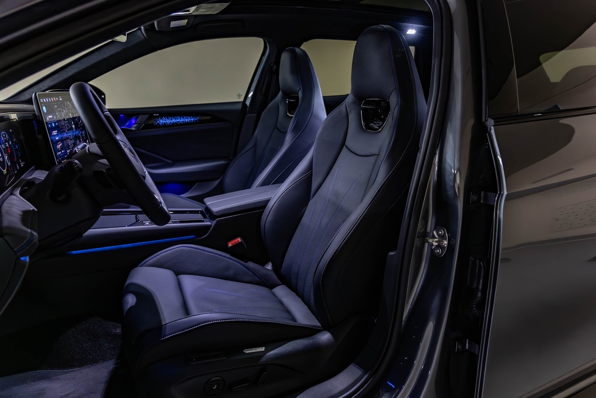 除了在動力部分帶來無與倫比的駕馭感受,The all-new Passat 430 TSI R-Line Performance車型在材料和設計上精心鋪陳,呼應消費者對於個性、運動化和奢華感的期待和追求,外觀部分擁有囊括高光澤黑化運動前保桿、車型銘牌、窗框飾條和車頂行李架的R-Line Signature 專屬黑化外觀套件,加上專屬黑色車頂、高光澤黑化後視鏡、黑化R-Line銘牌與19吋黑化Leeds鋁圈,處處彰顯霸氣跑格氛圍。進入車內,在門把、中控飾板和方向盤等細節上,皆佐以高光澤黑色烤漆或鎗灰色,連同繡有R-Line專屬對比色車縫線的ArtVelours包覆儀表台與門內飾板,帶來沉穩帥氣的視覺效果,而同級唯一R-Line Signature 專屬 ArtVelours 類麂皮湛黑頂篷更是從車頂延伸到A、B柱以及前座遮陽板完整包覆,悉心營造品味質感空間,搭配Puglia 植鞣真皮ergoActive 跑車運動型座椅,經過橄欖葉鞣製而成的皮革,不僅耐久性良好,根據使用習慣和時間會產生不同色澤,創造個人獨特樣貌,同時,前後座雙層隔音膠合玻璃/後座及後擋隱私玻璃,大幅提升車室靜謐性與安全。