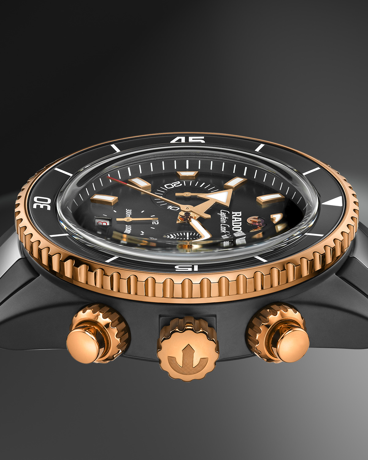 兩款腕錶均搭載R801自動上鍊機芯,具備長達59小時的動力儲存,厚度精心控制在16.2毫米以內保持極佳的佩戴舒適度與靈活性。整體錶盤佈局井然有序,時針與分針以粗獷陽剛的造型呈現,並覆蓋白色Super-LumiNova®夜光塗層,即使在光線昏暗的環境中,也能輕鬆辨識時間;計時秒針、分鐘計時針與小時計時針的紅色漆面針尖設計,不僅提升了辨識度,也為整體造型注入動感活力。三個副錶盤構築豐富層次、動感十足,而計時小時盤的嶄新加入,更讓庫克船長計時腕錶系列進一步升華。在細節設計方面,6點鐘位置設有梯形日期窗,與時標的輪廓完美呼應。在鐘錶世界中,「運動與優雅兼具」的說法屢見不鮮,然而,Rado瑞士雷達表Captain Cook庫克船長高科技陶瓷計時腕錶以無可爭議的氣度,將這兩者完美融合,毫不妥協。