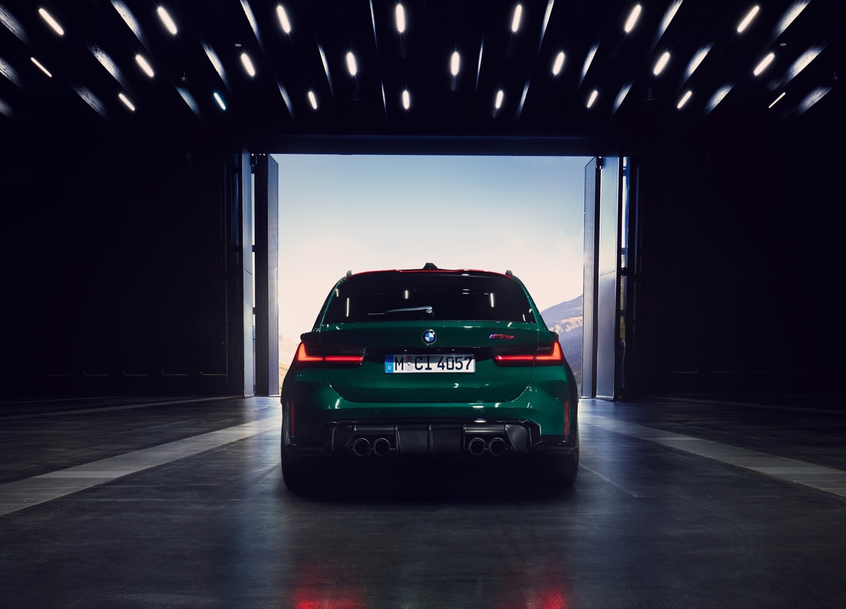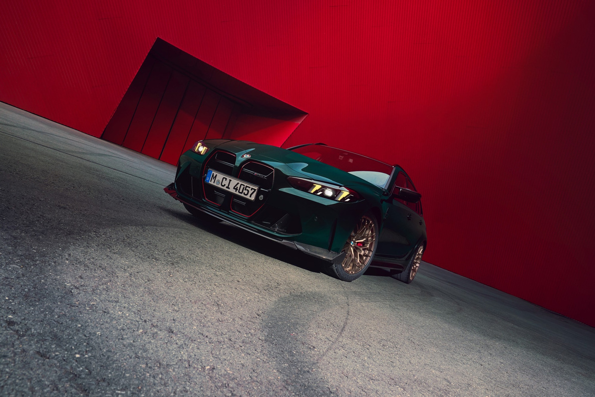 承襲M4 GT3常勝賽事基因,全新首創BMW M3 CS Touring外型充滿CS專屬的競技設計,以大量碳纖維複合材質打造的引擎蓋、前定風翼、前進氣口、後視鏡蓋、後下擾流等,相較BMW M3 Touring車重更輕15公斤,除提供輕量化且堅固的車身結構,更營造令人熱血澎湃的視覺效果;融合BMW GT賽車黃色日行燈的光型變化智慧LED頭燈、以紅色線條強化的專屬設計雙腎型水箱護罩以及尾翼線條,創造出令人熱血沸騰的賽車跑格。全新首創BMW M3 CS Touring外觀車色提供四款選擇:BMW Individual專屬的 British Racing Green 與 Laguna Seca Blue,以及 Frozen Solid White 與 Black Sapphire Metallic,滿足車主從高調熱血到低調經典的多元品味。