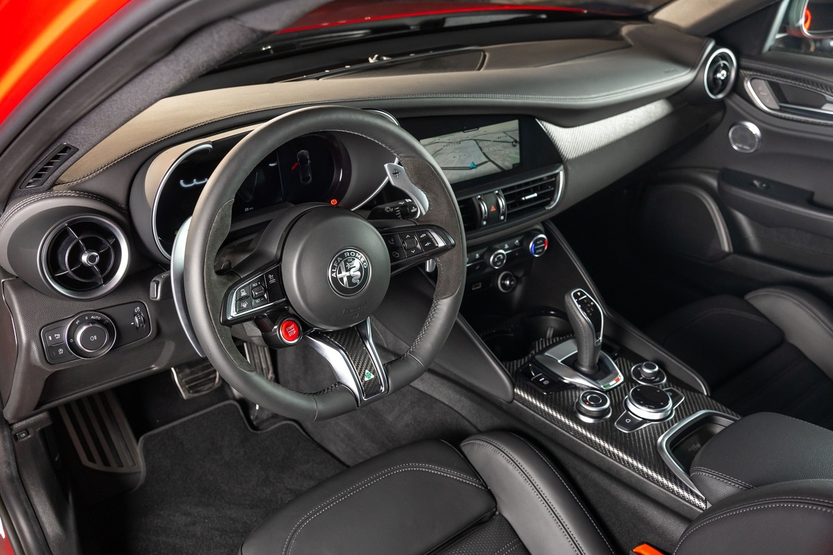 內裝則以 3D 裸紋式碳纖維格紋飾板貫穿座艙,彰顯 Quadrifoglio 獨有的賽道氛圍。專屬方向盤融合碳纖維與麂皮材質,並配置超跑級紅色引擎啟動按鍵,一觸即點燃駕駛熱情。高包覆性運動化座椅結合細膩縫線與電動調整功能,兼具豪華舒適與激烈操駕時的穩定支撐,讓每一次駕馭都能沉浸於純正的義式賽道氛圍之中。