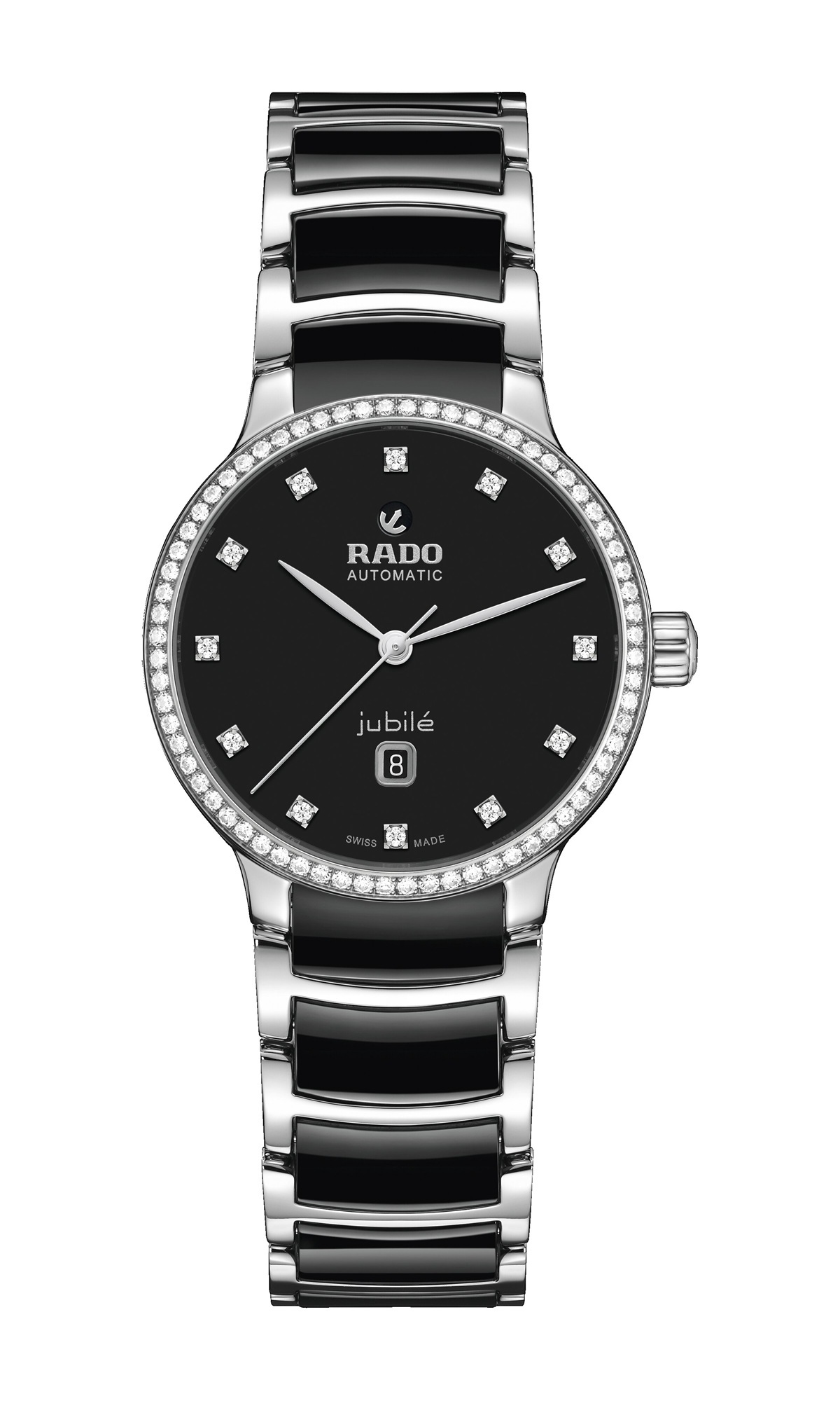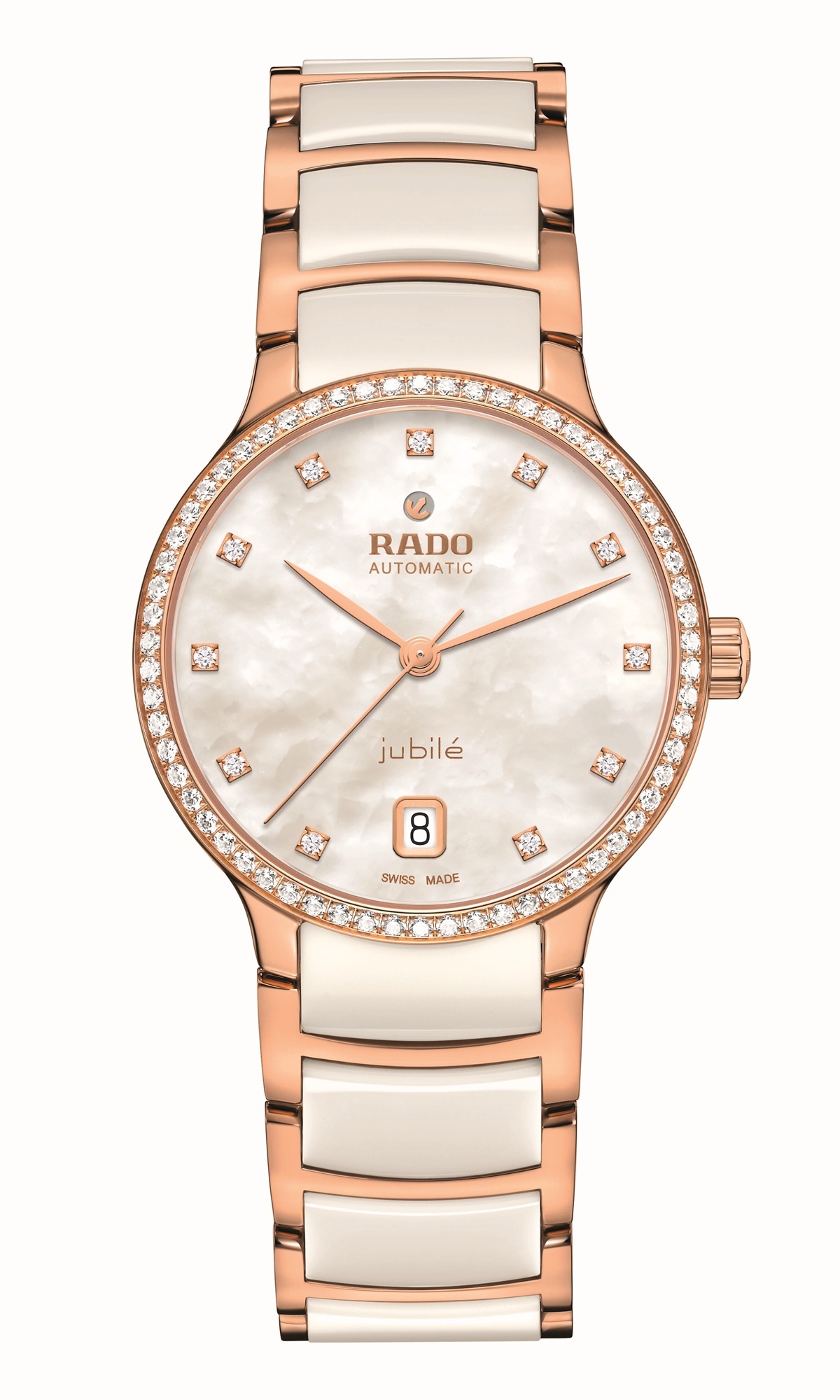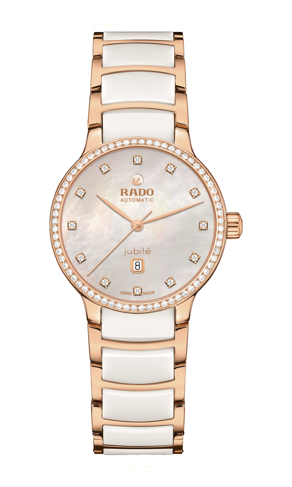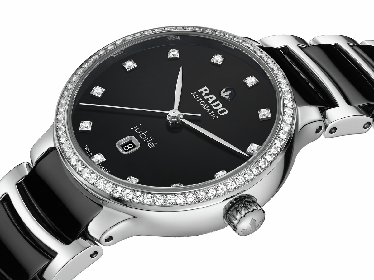 白色珍珠母貝/黑色亮漆錶盤,Jubilé 標誌款式,鑲嵌 12 顆鑽石,120/125,頂級威塞爾頓鑽石,淨度 VS-SI,足瓣切割,總重 0.085 克拉,玫瑰金色/銠金色可轉動錨型標誌,玫瑰金/銀色 Rado 及 Automatic 標誌印刷。