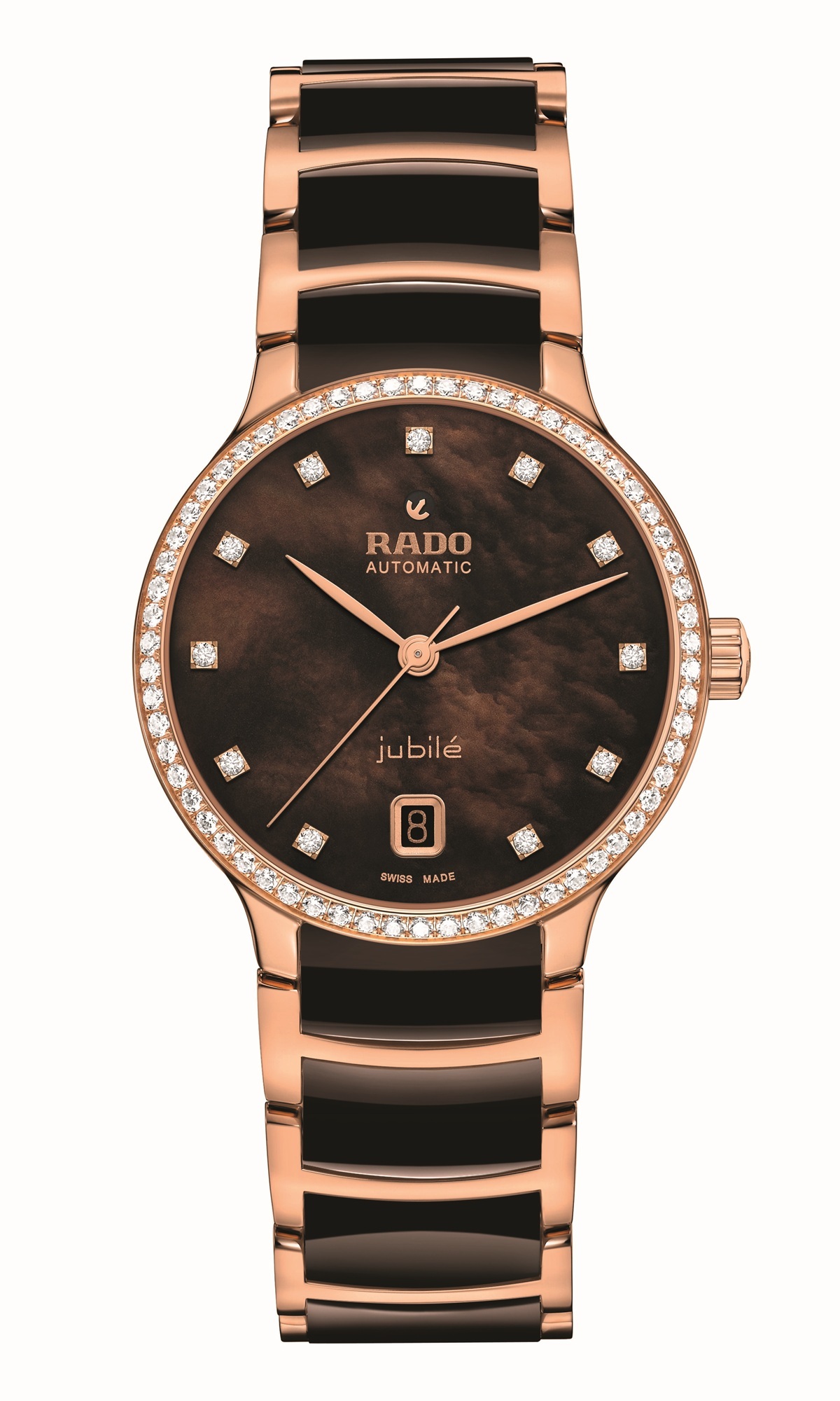 鑲嵌鑽石,11顆鑽石,135/140,頂級威塞爾頓鑽石,淨度VS-SI,足瓣切割,0.11克拉,玫瑰金色可轉動錨型標誌,玫瑰金色Rado及Automatic標誌,棕/白色珍珠母貝。
