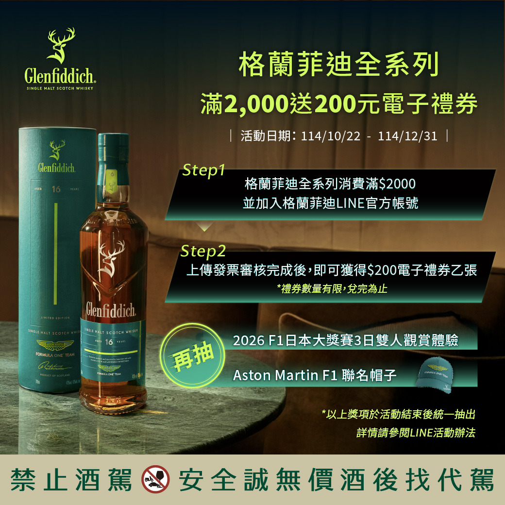 格蘭菲迪更將熱潮擴展至全台指定合作通路,10/22至12/31綁定官方LINE帳號並購買格蘭菲迪全系列商品滿NT$2,000,即可獲得NT$200電子禮券(數量有限,兌完為止);完成發票登錄者,更有機會抽中「Aston Martin F1聯名帽子」,以及終極大獎「2026 F1日本大獎賽3日雙人觀賞體驗」。格蘭菲迪邀請全台消費者一同沉浸於速度與品味交織的盛宴,讓每一次舉杯,都是邁向非凡旅程的起點。