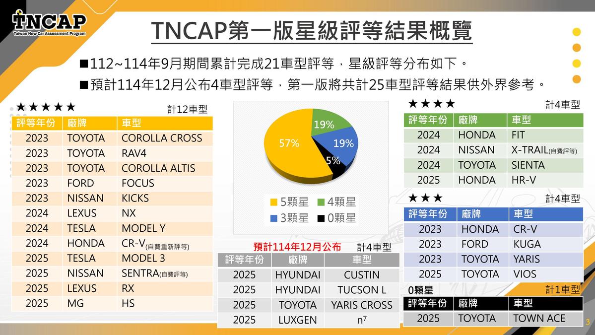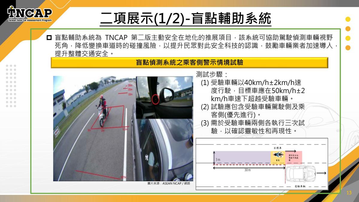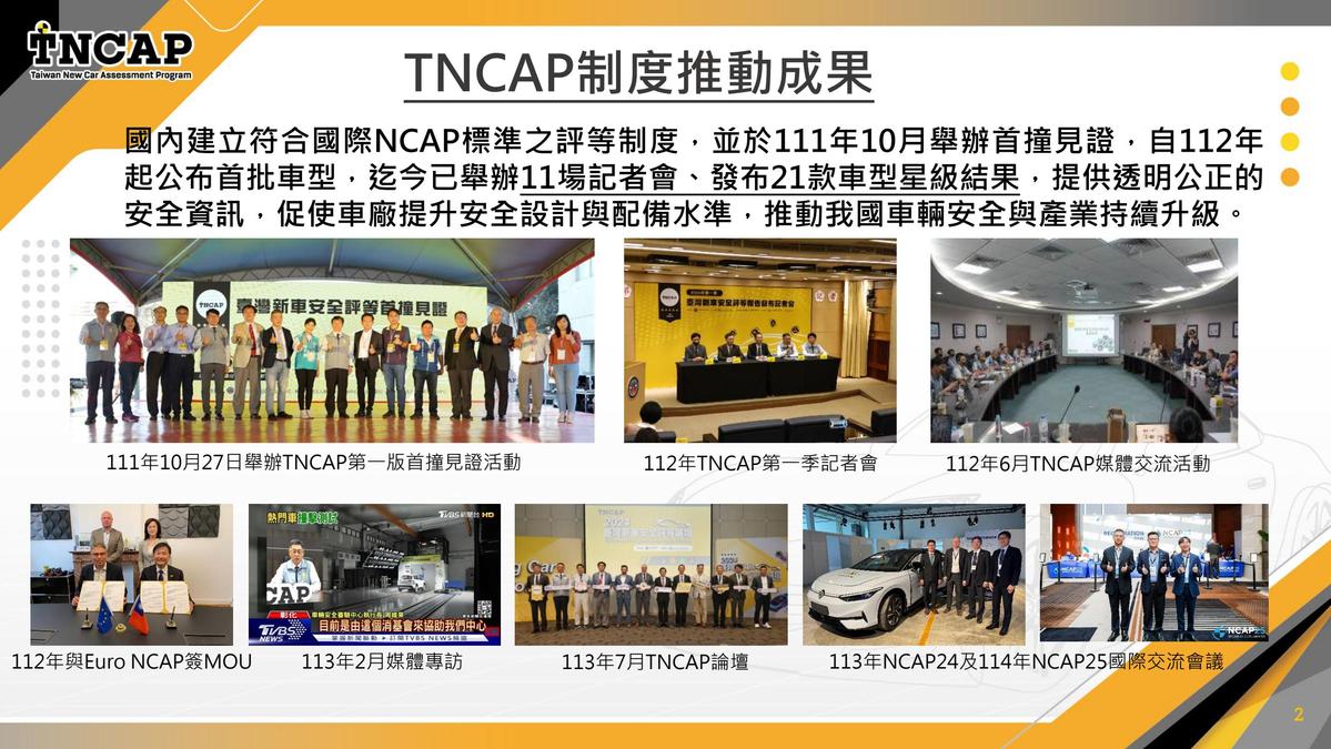 交通部表示,秉持「以人為本、安全至上」的施政理念,建立符合國際NCAP標準的TNCAP制度,讓臺灣成為國際第13個NCAP國家組織,並於111年10月27日辦理首撞見證活動後,自112年第一季起公布首批2車型評等結果後,迄今共已舉辦11場次記者會完成公布21個車型的星級評等結果,並將車輛相關安全資訊公開於TNCAP網站平台(https://www.tncap.org.tw),成功接軌國際新車安全評等制度。為持續提升車輛安全標準、提供消費者更透明、客觀的車輛安全資訊並回應國人對行車安全的期待,交通部於113年5月29日公布「交通部臺灣新車安全評等規章第二版」,新版規章除參考國際最具代表性的歐洲Euro NCAP主、被動安全試驗與評價之更嚴苛標準以提升整體安全性能外,亦更強化納入與臺灣交通環境相關的2項在地化評等項目,分別為因應電動車的普及性,新增電動車碰撞後之觸電保護評等,以及考量較高的汽機車間事故案件率,新增盲點輔助系統等,期TNCAP能更貼近國人的用路環境與事故樣態及民眾安全需求。