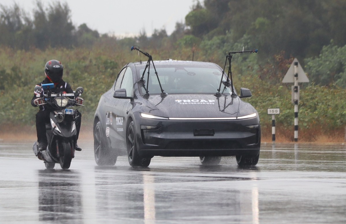 2. 盲點輔助系統(BSD)試驗:模擬機車行駛至受驗車輛側方時,系統偵測機車並提供駕駛警示提醒,期能降低車輛變換車道時的側方碰撞風險。