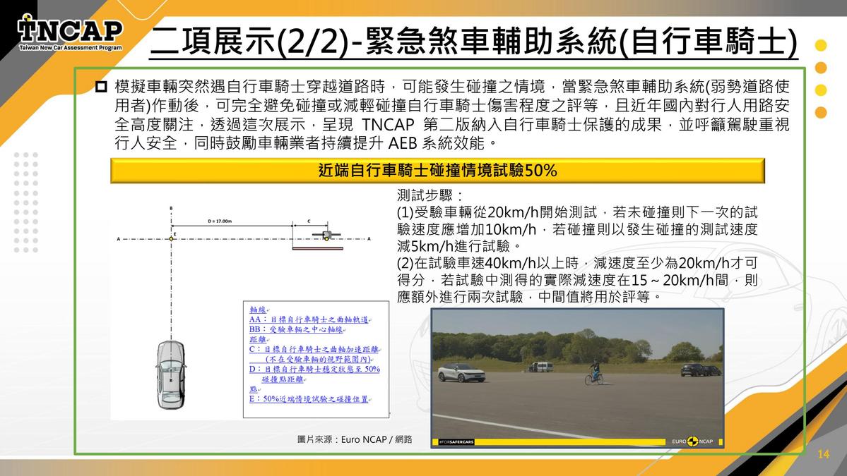 1. 緊急煞車輔助系統(自行車情境試驗):模擬車輛行進間突遇自行車騎士穿越道路的情境,評估該系統能否主動偵測並提供輔助煞車功能,期能避免碰撞風險或減輕碰撞傷害。