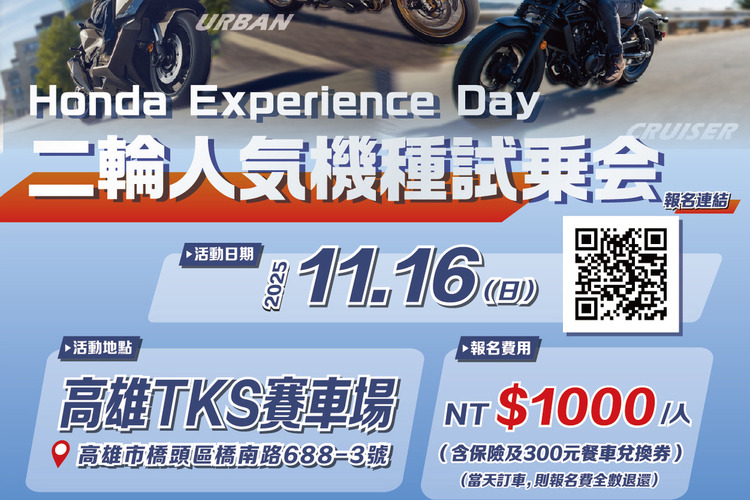 Honda Taiwan秉持「The Power of Dreams – How we move you.」的品牌精神,致力於提供卓越的產品與服務,豐富的產品線讓各式風格的騎士皆能享受騎乘的樂趣,為了讓更多喜愛Honda二輪產品的顧客體驗無與倫比的騎乘樂趣,於近日在台中麗寶國際賽車場舉辦【2025 Honda Experience Day|二輪人気車種試乘会】,吸引眾多喜愛二輪的顧客熱情參與,現場氣氛熱烈非凡,不僅能親身感受從都會街頭到長途巡航,Honda多款人氣車款的卓越性能,活動現場更設置遊戲互動區與多台美味餐車,在試乘之餘,享受美味餐點,並與同好交流騎乘心得,享受完整的二輪生活體驗。延續台中場的熱潮【2025 Honda Experience Day|二輪人気車種試乘会