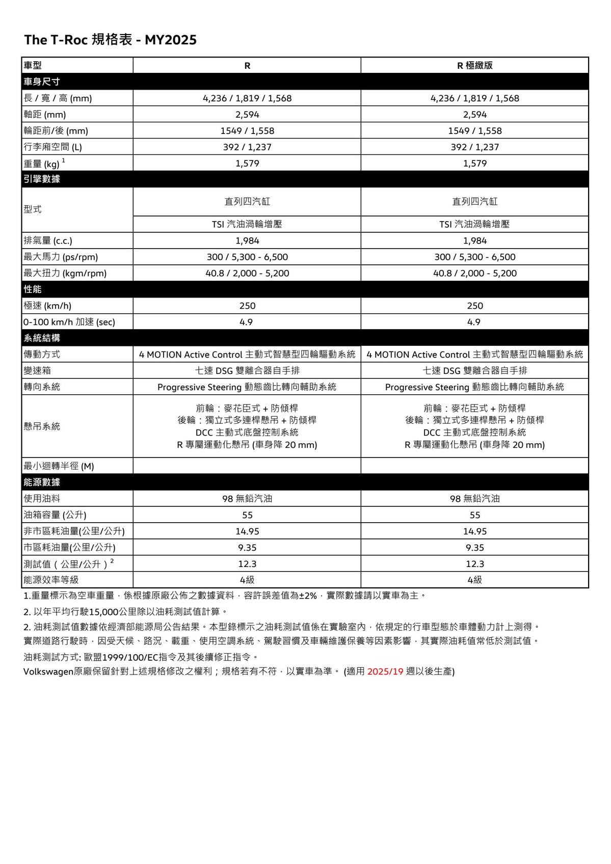 The T-Roc於2017年問世後,短短不到十年間即席捲車壇,全球累積超過200萬銷量,成為品牌最為成功的休旅車款之一,而注入Volkswagen R部門精心調校性能駕控與賽道基因的T-Roc R,搭載2.0升直列四汽缸TSI渦輪增壓引擎,更帶來最大馬力300ps、最大扭力40.8kgm以及零百加速4.9秒的極致剽悍體驗。今台灣福斯汽車宣告The new T-Roc R極緻版重磅登場,絕無僅有的R 極緻版專屬套件擁兩種專屬車色:首次在台引進Volkswagen R部門獨有研發新色—「霧影消光灰」及時尚前衛的「金屬流光銀」,並且選用19吋Pretoria鋁合金輪圈,成為路上脫穎而出的迷人存在,現正配合政府汰舊換新貨物稅減徵後享172.8萬元起,且可以4萬元超值優惠價升級霧影消光灰車色套件(價值10萬元),數量有限,敬邀即刻入主實現品味駕馭。