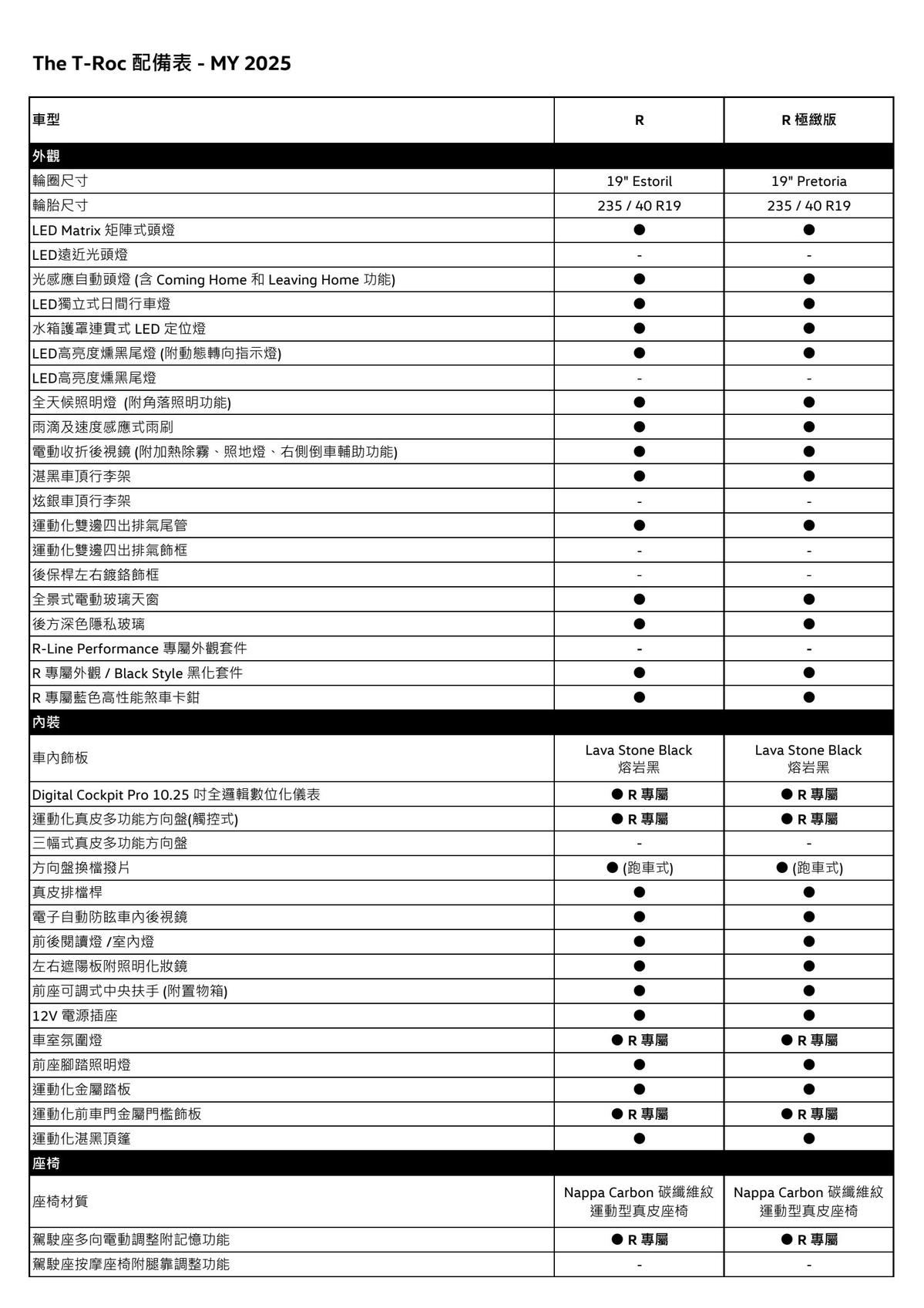 The new T-Roc R極緻版設計俐落簡潔,銳利折線與R 專屬外觀 / Black Style 黑化套件刻劃氣勢萬鈞的戰鬥姿態,車頭具R 專屬運動化前保桿,以水箱護罩連貫式 LED 定位燈連結兩側IQ.LIGHT 智慧燈組:LED Matrix 矩陣式頭燈和 DLA 動態頭燈自動切換,前方與側邊綴上辨識度極高的R 徽飾及R專屬銘牌,自黑化風格後視鏡罩、湛黑車頂行李架,至黑化風格窗框、後方深色隱私玻璃與碳纖維風格 C 柱設計,無處不以細節展現強烈張力和卓越質感,流線輪廓延伸至車尾斜背造型與LED高亮度燻黑尾燈(附動態轉向指示燈),由運動化雙邊四出排氣尾管及黑化風格排氣飾框勾勒出霸氣背影,此次新增R 極緻版專屬套件更是如虎添翼,純粹而具未來感的「金屬流光銀」車色,搭配專屬 19 吋 Pretoria 鋁合金輪圈,外觀簡約洗鍊卻蘊藏強勁動能的反差魅力讓人愛不釋手,輕鬆悠遊於日常都會和帥氣跑格之間。而由台灣福斯汽車初次在台獻上的Volkswagen R部門限定色,嶄新「霧影消光灰」車色套件,沉穩大器的身姿低調而高貴,佐以黑色車門把手畫龍點睛,流露與生俱來無法掩蓋的剛烈鋒芒,展現非凡個人品味同時強化運動操駕體驗。