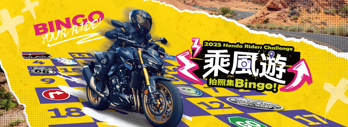 2025 Honda Motorcycle 乘風遊 Bingo your ride活動,為了讓所有參與的車主更加方便了解各項資訊,相關報名事項及活動辦法將透過乘風遊專屬網站公告(https://eventmoto.honda-taiwan.com.tw/riders-challenge),此次乘風遊除了延續各景點拍照解任務活動之外,除原有的里程挑戰賽之外,還新增了多項挑戰任務,包括景點Bingo連線,大幅增加活動內容的豐富及趣味性,不只留下難忘的旅程足跡,還有機會將豐富好禮帶回家。快加入騎士們的行列,解鎖專屬你的冒險地圖!誠摯邀請所有Honda Motorcycle車主都能一同參加乘風遊活動,享受騎乘的喜悅同時探索台灣之美。
