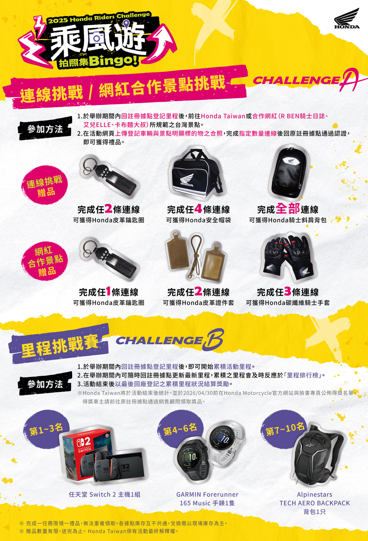 *詳細活動內容請詳見2025 Honda Motorcycle 乘風遊 Bingo your ride網站: ( https://eventmoto.honda-taiwan.com.tw/riders-challenge )