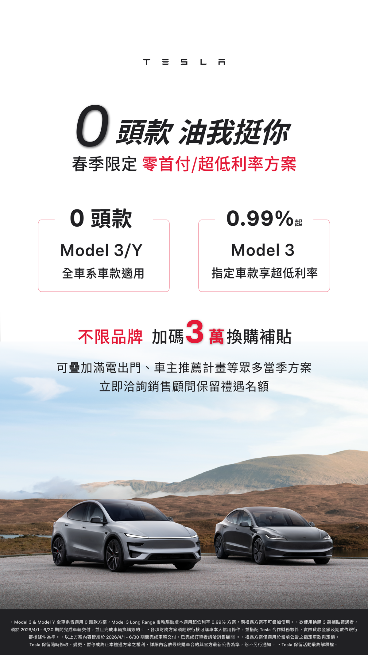 ●Model 3 及 Model Y 雙車系皆可零頭款入主