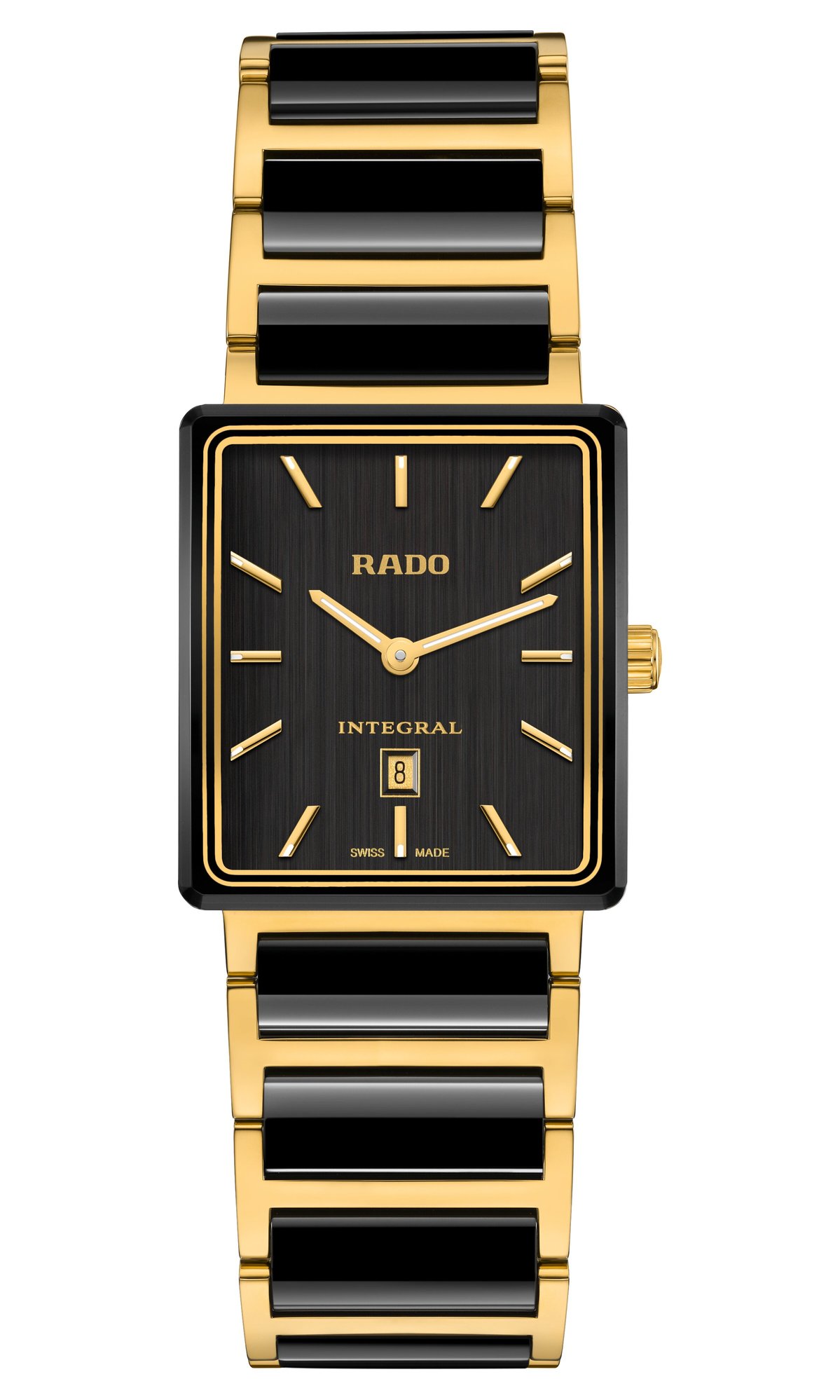 黑色垂直拉絲,黃金色指針,覆有Supe-LumiNova*夜光塗層,黃金色Rado及Integral標誌。