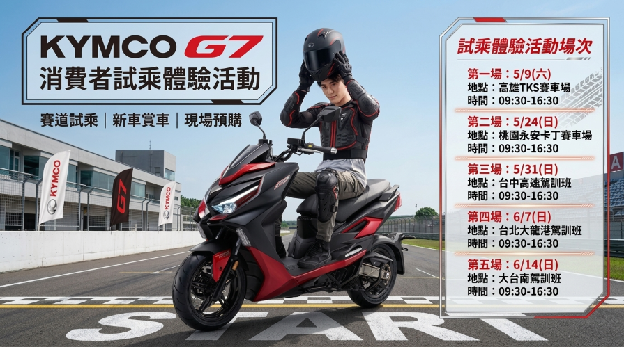 為讓全台消費者都能親身體驗旗艦白牌跑旅 G7 實力,光陽也正式宣布「G7 全台巡迴試乘會」正式解鎖,有興趣的消費者請鎖定 KYMCO 官方平台!